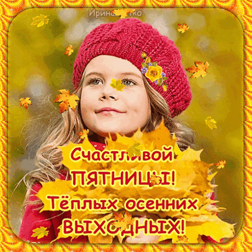 A young girl in a red hat holds autumn leaves, wishing a happy Friday and warm autumn weekend.