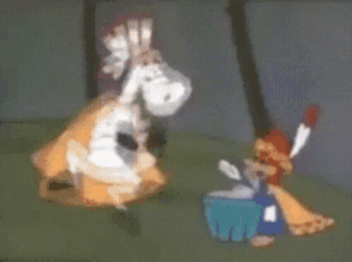 Picapau Macumba cartoon characters dancing with a drum, one with a headdress, in a stylized scene.