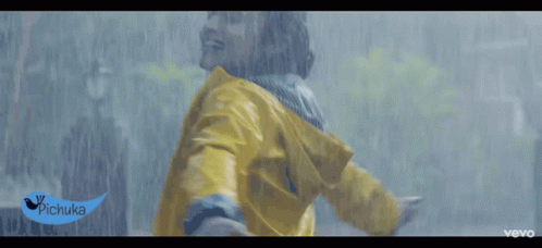 Alia Bhatt joyfully laughing and dancing in the rain, wearing a yellow raincoat. From Pichukka Pichukka.