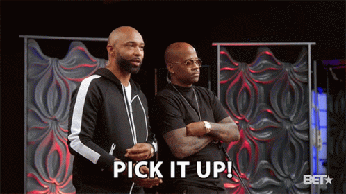 Damon Dash and another man on stage, with the phrase 'Pick It Up!' displayed prominently on screen.