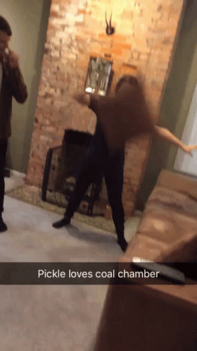 Pickle (Amber) humorously swings a pillow, with the caption 'Pickle loves coal chamber'.