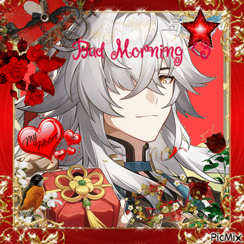 Jing Yuan from Honkai Star Rail looking tired on a 'bad morning', with a red heart graphic saying 'my heart'.