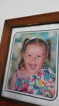 A delightful framed photo of a little girl with pigtails, beaming with a wide smile in a floral dress.