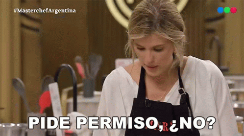 María Del Cerro from Masterchef Argentina asks 'Pide Permiso, ¿No?' in a kitchen setting.