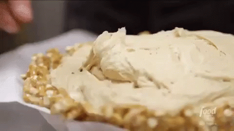 Hanna Hart spreading a creamy, light-colored icing onto a delicious pie with a pretzel crust.