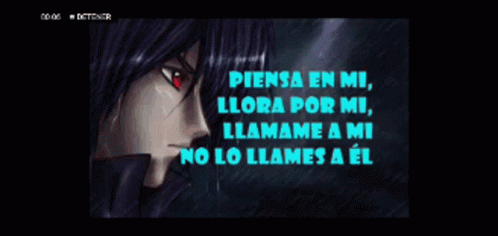 An anime-style character with red eyes and dark hair, accompanied by Spanish text about longing and heartbreak.