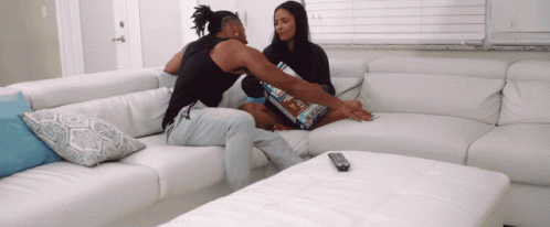 Nohemy Aguila and her boyfriend on a couch, having a dramatic moment with a phone and a box.