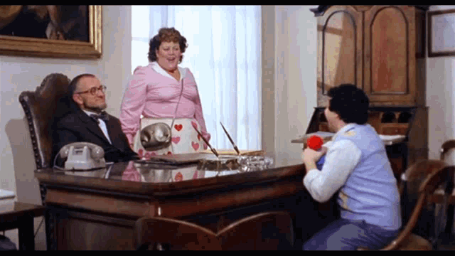 Alvaro Vitali as Pierino, a woman, and a man in a suit engage in a funny office interaction.