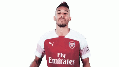 Pierre Emerick Aubameyang proudly pats his chest while wearing a red and white Fly Emirates jersey.