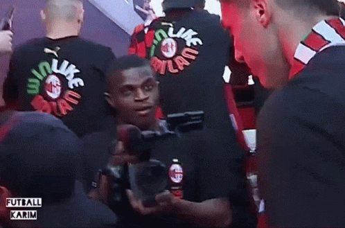 Pierre Kalulu smiling while holding a camera, wearing an AC Milan shirt at a club event.