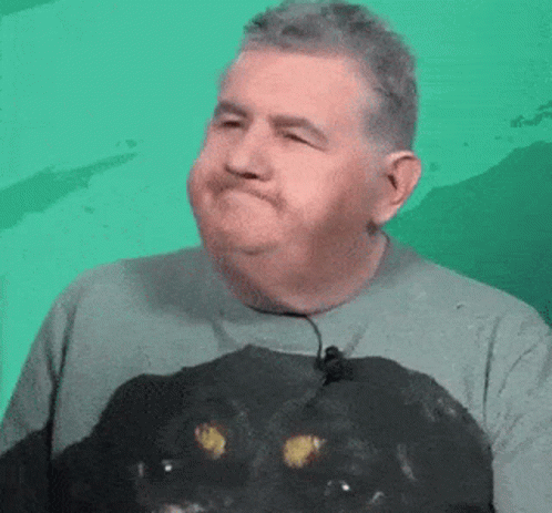 Pierre Menes making a funny face while wearing a grey t-shirt with a black panther design.