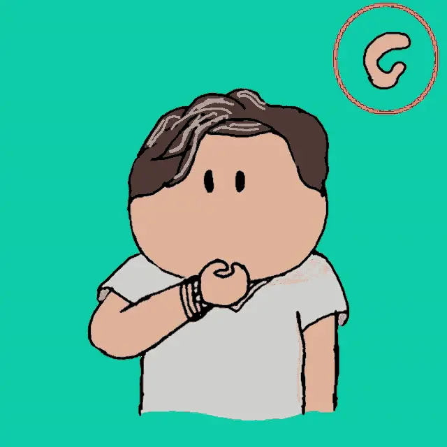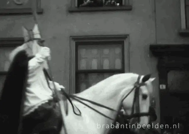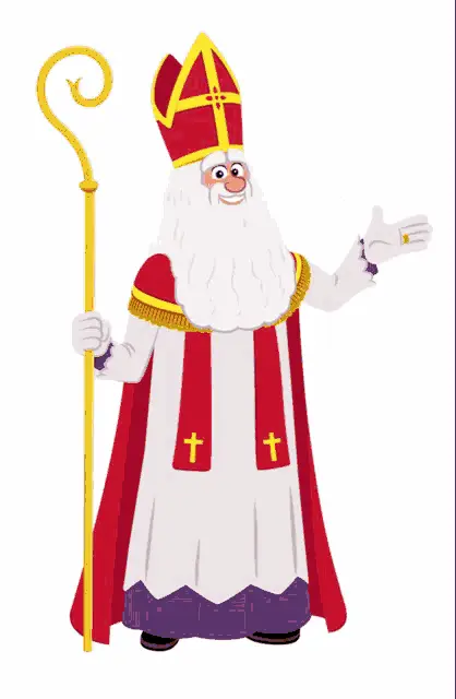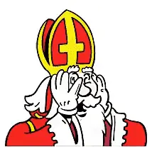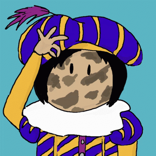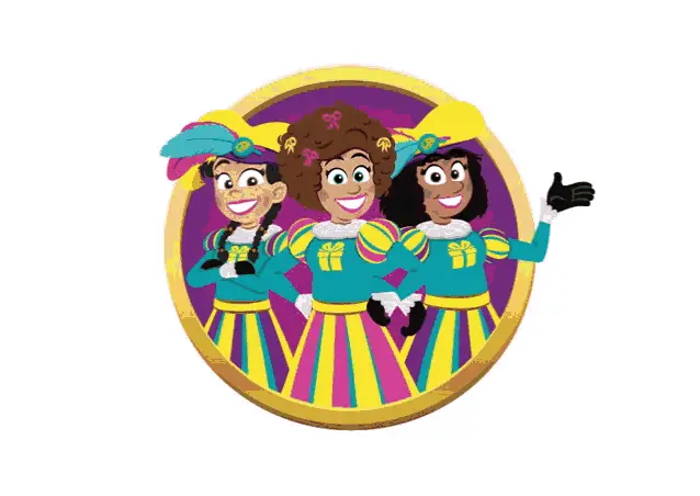 Piet Beterdatje, a Sinterklaas helper, in a cartoon drawing, wearing a purple and yellow costume and making a peace sign.