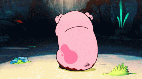 Waddles the pig from Gravity Falls sits with a snail on its back, looking cute and slightly grumpy.