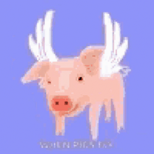 A charming pixel art animation of a pink pig with wings standing on a cloud, embodying the idiom 'When Pigs Fly'.