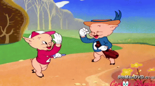 Porky Pig and another pig joyfully dancing, playing music, and laughing together in a classic cartoon scene.