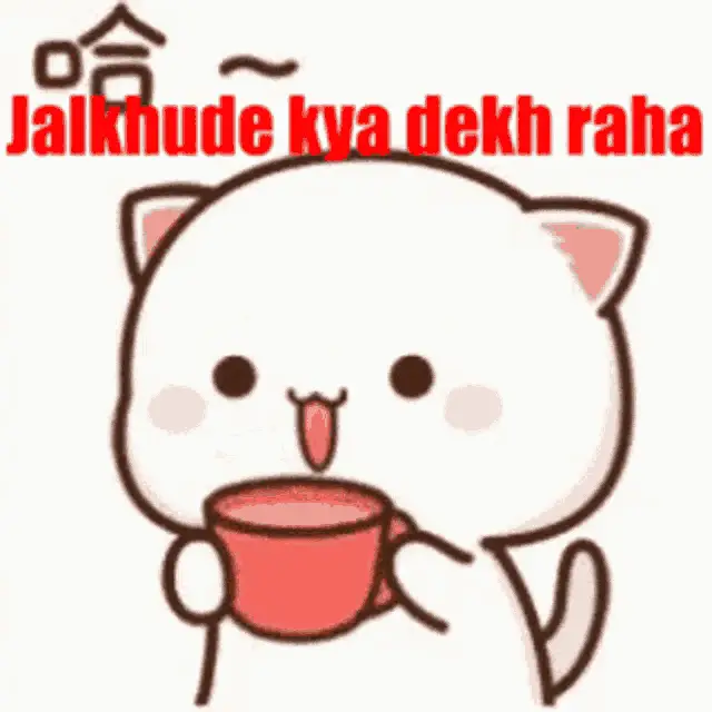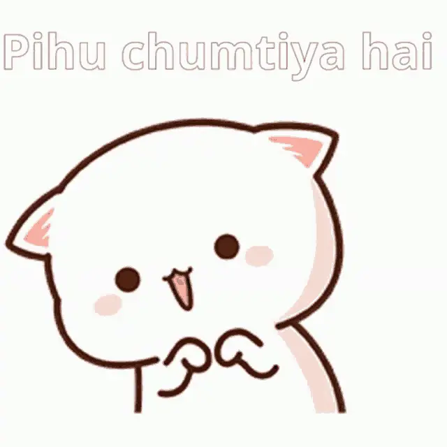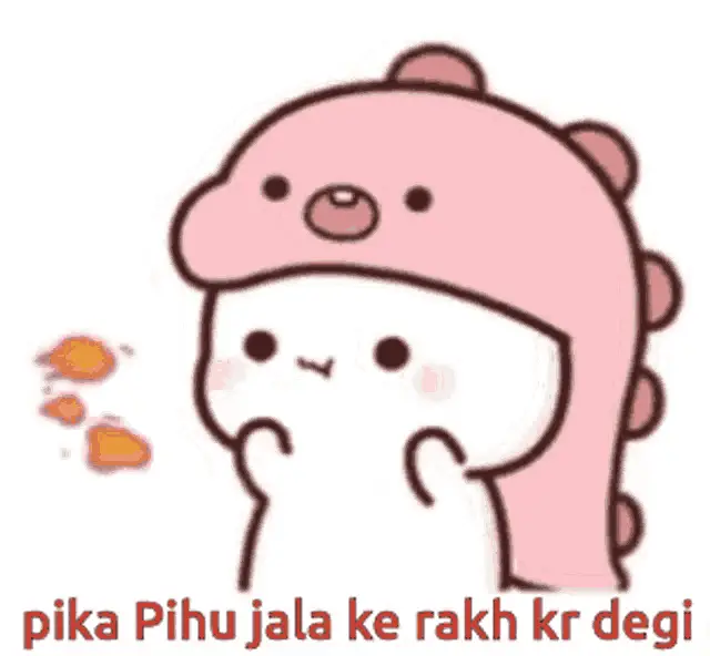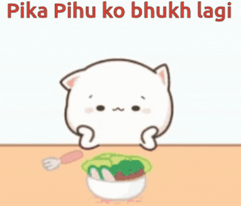Pika Pihu, the cute cartoon cat, is hungry and contemplating a bowl of food with a question mark above its head.