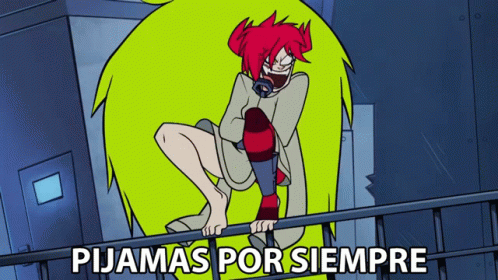 Demencia from Villanos (Villainous) on a railing, with the text 'Pijamas Por Siempre' (Pajamas Forever).
