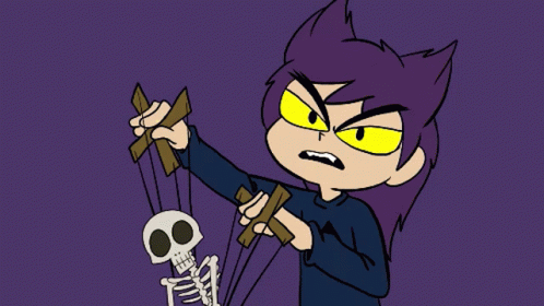 Анимация персонажа Пик из 13 Карт с фиолетовыми волосами, желтыми глазами и свитером с пиковой мастью.
