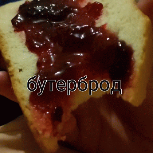 A close-up of a sandwich with jam, with the Russian word 'бутерброд' (sandwich) overlaid.