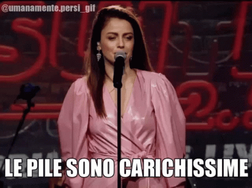 Annalisa, in a pink dress, sings into a microphone with the Italian text 'LE PILE SONO CARICHISSIME' displayed.