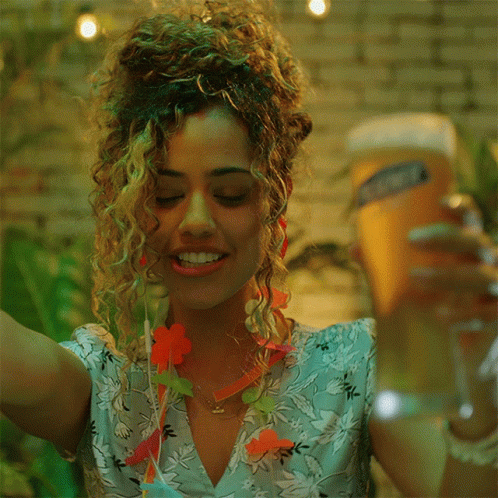 Woman with curly hair dancing and holding a Pilsenerlight beer, wearing a colorful lei at a party.