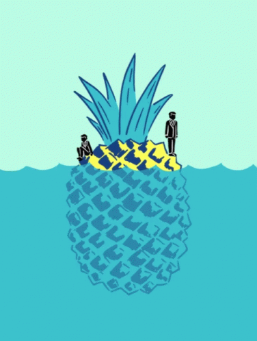 Two men stranded on a giant pineapple floating in the ocean.