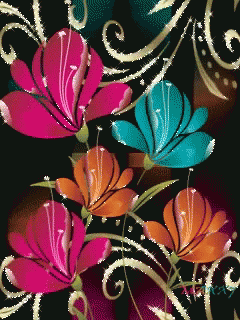 Colorful pink and blue flowers with illuminating saffron on a black background, featuring swirls and leaves.