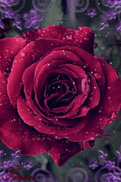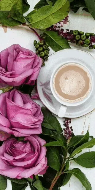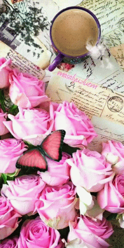 Steaming coffee, glitering pink roses, and a red butterfly on vintage letters create a romantic scene.