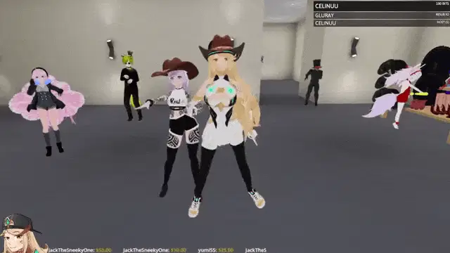 Pinkie Pop, a cute anime cat-girl with pink hair and blue eyes, appears in a dimly lit VRChat environment.
