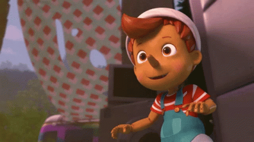 Pinocchio, the cartoon character, laughing heartily with eyes closed in a funny moment.