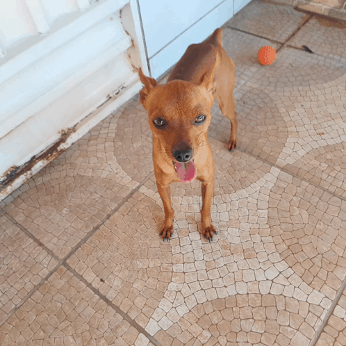 Pinscher Bob stands on a tiled floor, looking at the camera with his pink tongue out.