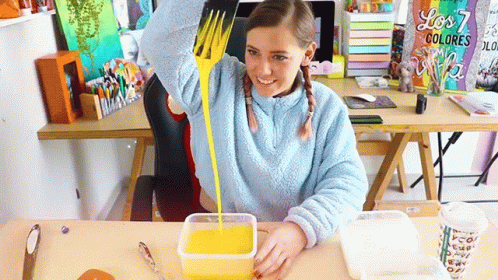 Daniela Hoyos mixing vibrant yellow liquid paint in a container with a large utensil.
