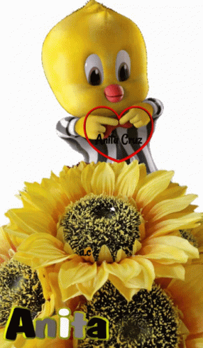 Cartoon character Piolin (Tweety Bird) holding a red heart with 'Anita Cruz' over a bouquet of sunflowers.
