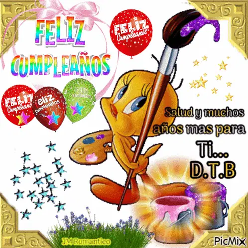 Piolin (Tweety Bird) holding a cup, surrounded by red roses and resting on a heart-adorned envelope.
