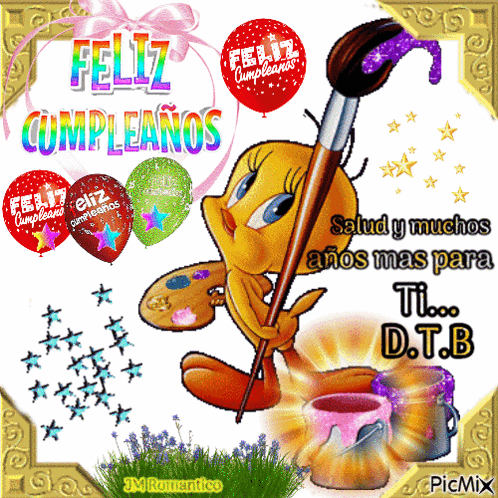 Piolin (Tweety Bird) wishes 'Feliz Cumpleaños' with a paintbrush and palette, surrounded by festive balloons.