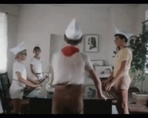 Young pioneers in Soviet Union uniforms dance energetically around a table, wearing paper hats and red scarves.