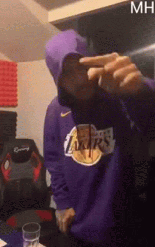 Reza Pishro, wearing a purple Lakers hoodie, makes hand gestures in a recording studio.