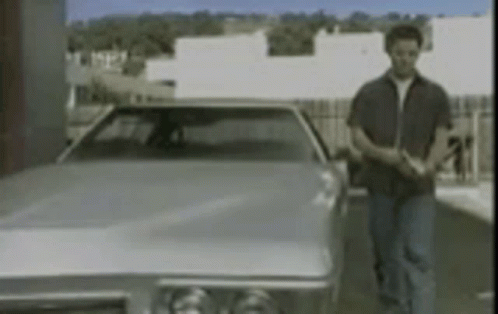 An annoyed man sits on a car hood in a parking lot, eating a snack and looking grumpy.