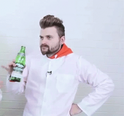 Max Brandt, wearing a white lab coat, drinks from a green bottle with a focused expression.
