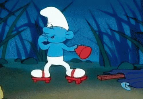 A Smurf on roller skates, or clogs, exclaims 'YUHUUU!!!' while dancing in a forest setting.