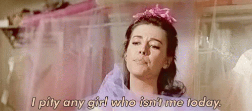 Maria from West Side Story, in a purple dress, proudly declares: 'I pity any girl who isn't me today.'