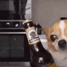 Chihuahua dog with wide eyes holding a beer bottle in its mouth, looking directly at the camera.