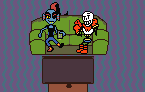 Undertale characters Undyne and Papyrus relaxing on a couch, watching TV, with Papyrus showing a heart.