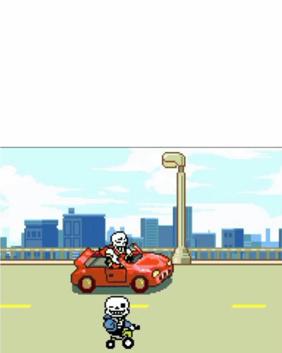 Sans from Undertale drives a red pixel art car on a road, featuring skeletons and a tricycle.