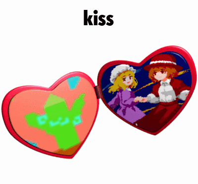 A red heart locket opens to show animated characters Renko and Renko's wife, with the word 'kiss' above them.