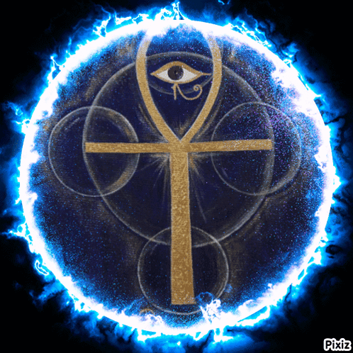 A vibrant Ankh symbol with the Eye of Horus, surrounded by glowing blue energy, featuring the Pixiz logo.