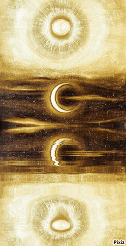 Stylized golden artwork featuring a sun, a crescent moon reflected in water, and a glowing shape, with 'Pixiz' branding.