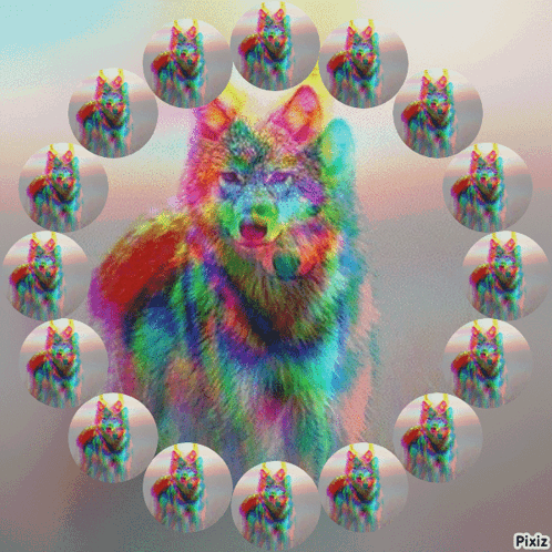 Colorful wolf art with smaller wolf images, created with Pixiz, set against a vibrant background.