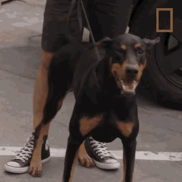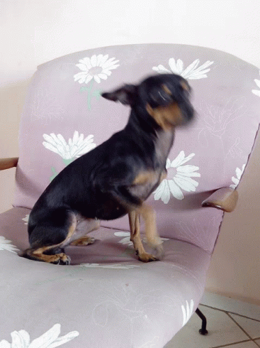 Pixoca the Pinscher sits attentively on a floral chair, looking around with curious expressions.