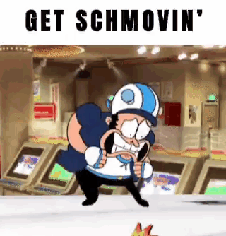 The Pizzaware character from Pizza Tower energetically dances with the caption "GET SCHMOVIN'".